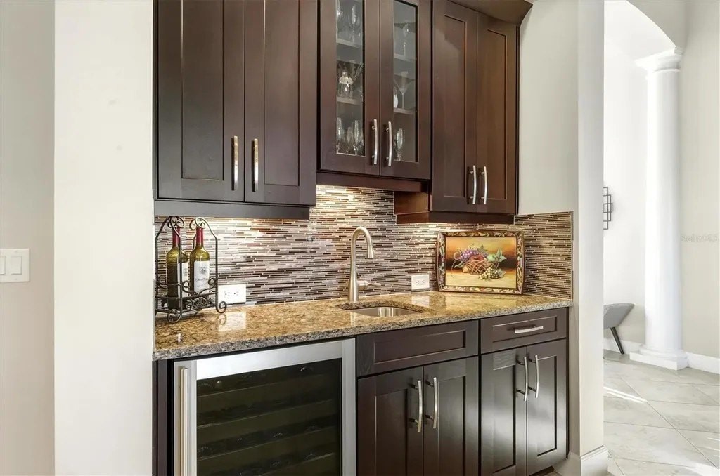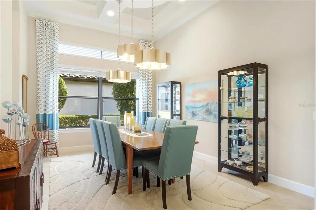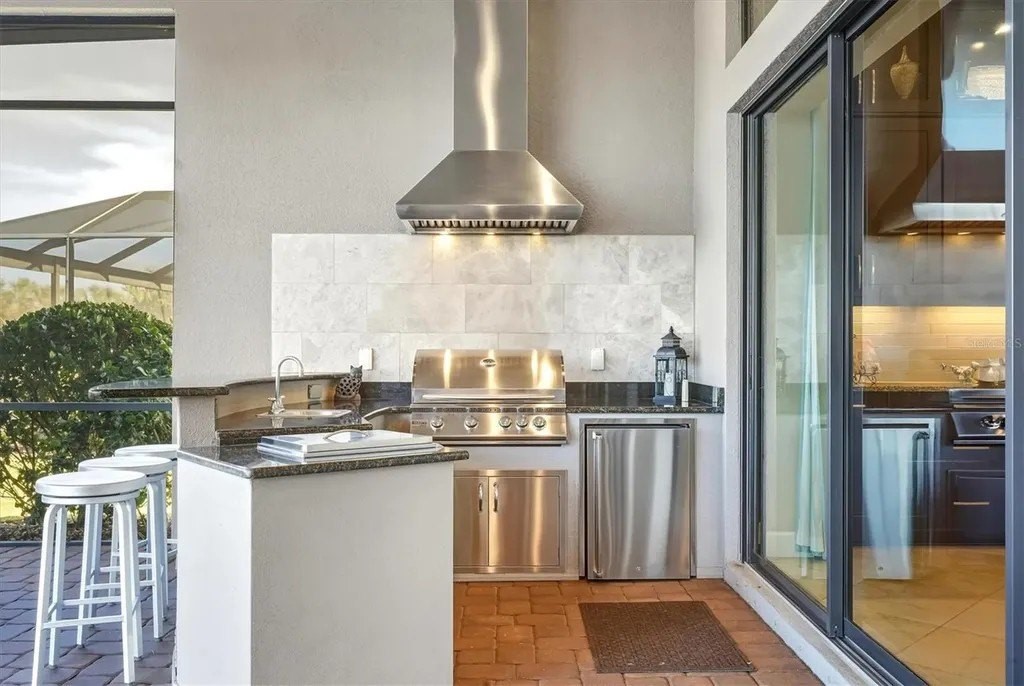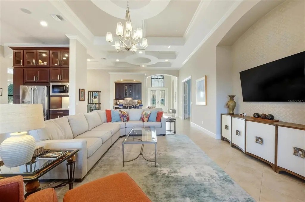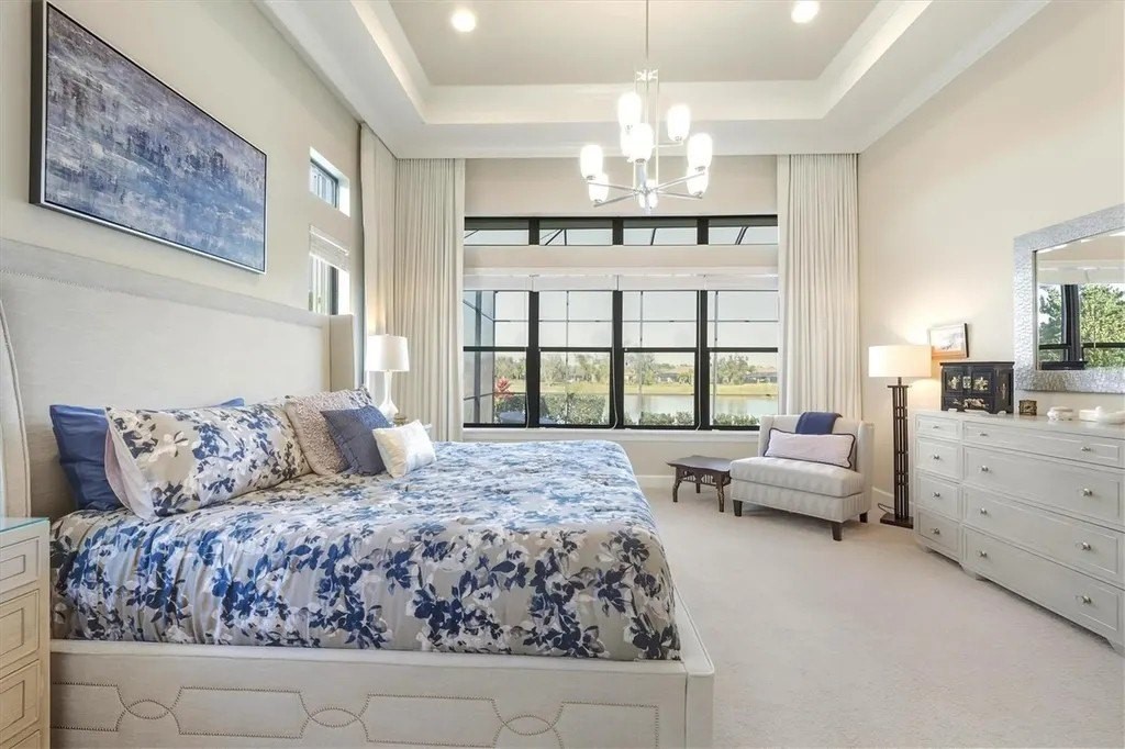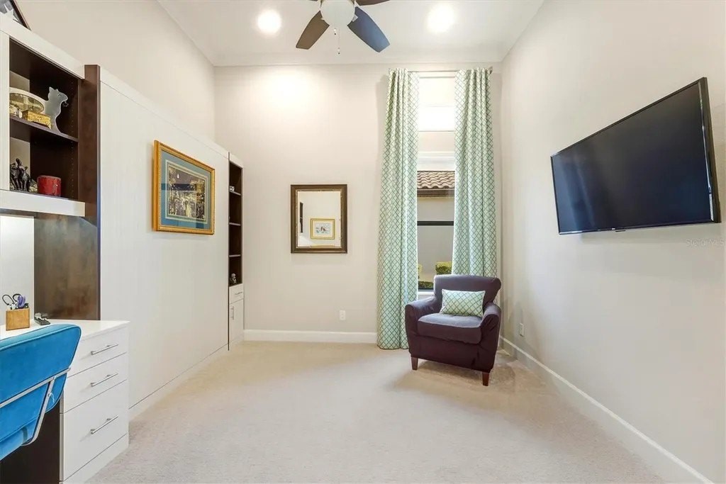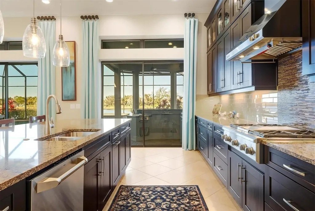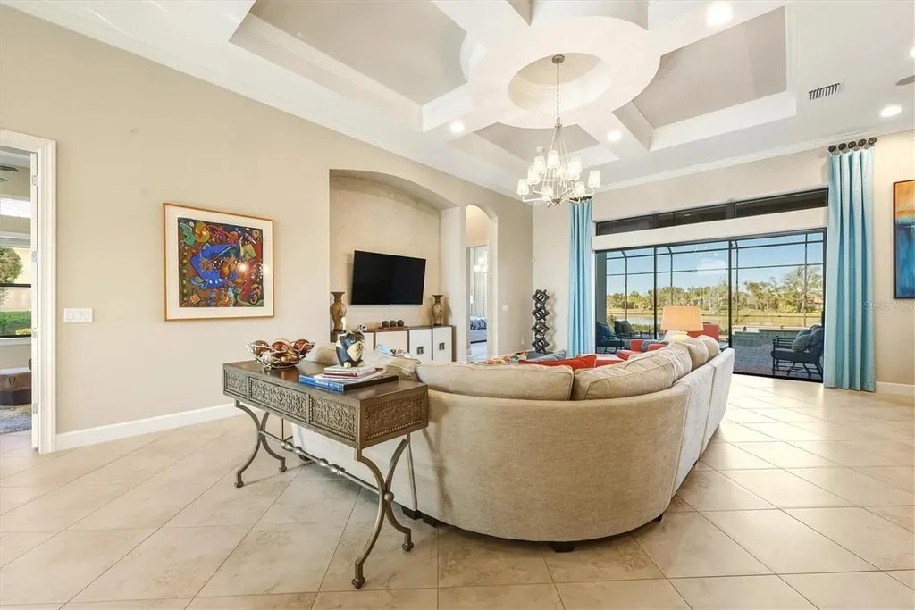 Wake up to tranquil pond views and the rare privacy every golfer appreciates-no cart path behind the home, just water, nature, and morning light. Located in Esplanade at Lakewood Ranch, this golf-deeded residence includes full golf privileges and delivers a true resort lifestyle where luxury meets everyday ease. Inside, refined architectural details immediately stand out. Crown molding throughout, spectacular coffered ceilings, and abundant recessed lighting create a sophisticated yet inviting atmosphere. A dedicated den/office with French doors provides the perfect space for working from home, a private study, or a quiet retreat. Designed for entertaining, the home features a wet bar with a wine cooler and a chef-inspired kitchen showcasing Monogram appliances, 42" cabinetry with glass uppers, and Sonos speakers both inside and outside on the lanai. The primary suite is a peaceful sanctuary complete with floor to ceiling custom blackout drapes and custom built-in closet systems. While the secondary bedrooms offer comfort for guests, the murphy bed allows the owner the flexibility to also use the third bedroom for crafts or exercise. Outdoor living truly shines on the private lanai-recently re-screened in November 2024-and fully equipped with remote rolldown hurricane screens, a full summer kitchen with extra power burner, and a heated pool and spa, creating a year-round space for relaxation and entertaining. Additional highlights include accordion shutters on the home's sides, pre-plumbing for a water softener and a three-car garage with a built-in storage rack system. Beyond the home, Esplanade's resort-style amenities elevate everyday living with championship golf, an onsite restaurant, tennis and pickleball, and an active social lifestyle. Perfectly positioned, this home is just minutes to UTC Mall, SRQ International Airport, and the world-renowned beaches of Anna Maria Island, Longboat Key, and Siesta Key, with Tampa an easy drive away. This is more than a home-it's the opportunity to enjoy golf, luxury, and location in one of Lakewood Ranch's most sought-after communities.